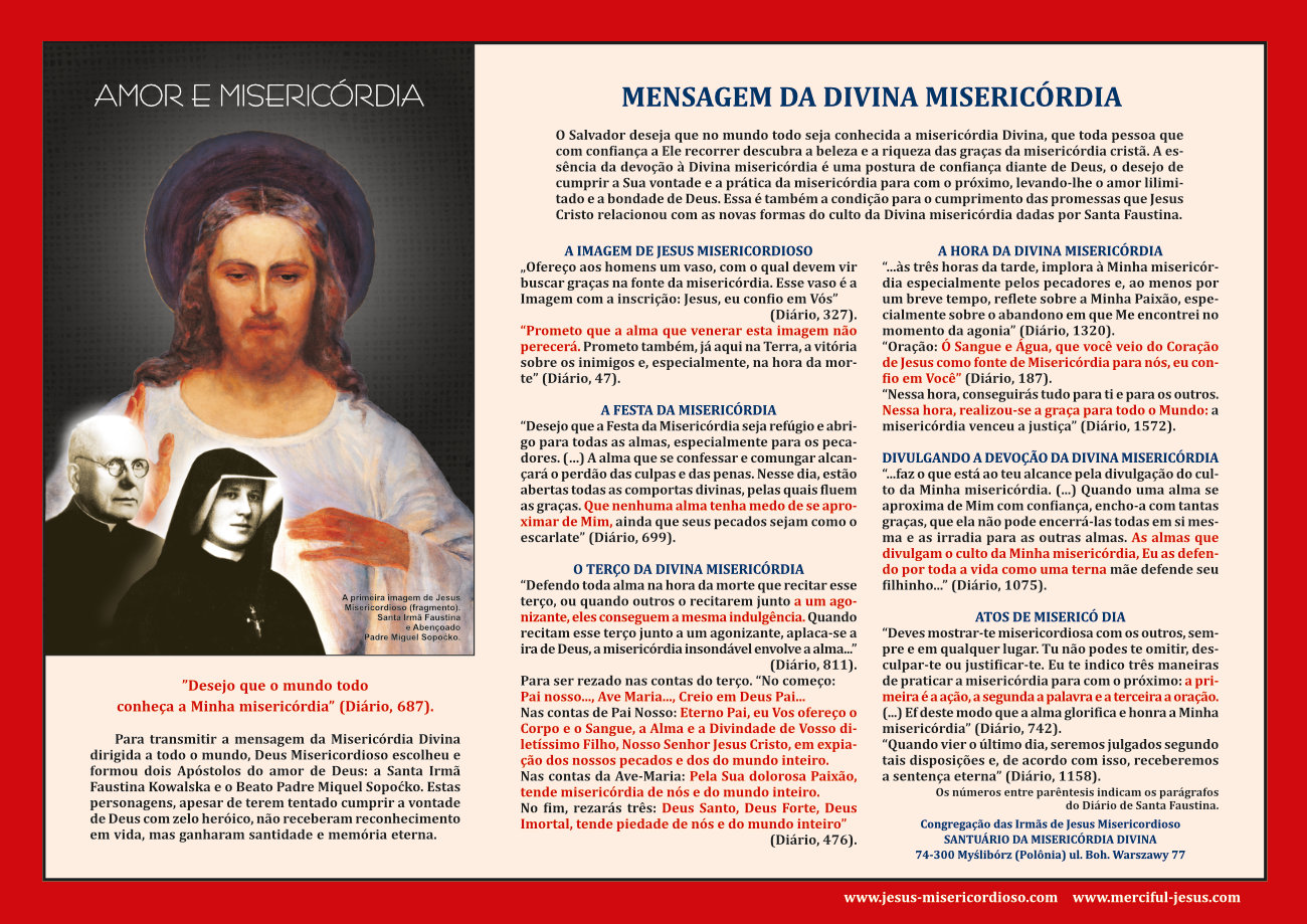A Congregação das Irmãs de Jesus Misericordioso implementa as novas formas de adoração à Divina Misericórdia comunicadas na Mensagem da Divina Misericórdia por meio de palavras, ações e orações em 35 casas religiosas na Polônia e no exterior, incluindo três postos missionários: na Bolívia, em Serra Leoa e na África do Sul. Além disso, através de fiéis leigos adoradores da Divina Misericórdia, esta Mensagem é divulgada em publicações online, livros, reproduções de imagens, cartazes e folders em vários idiomas para fins de evangelização - disponibilizada, entre outros, em prisões, escolas e locais de peregrinação.