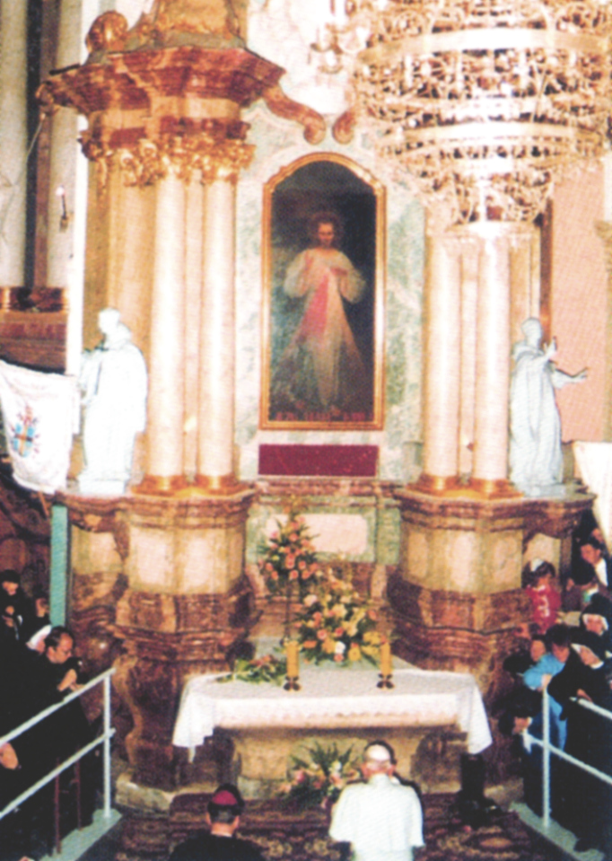 El 4 de abril de 1937, con el permiso del Metropolitano de Vilna, el Arzobispo Romuald Jalbrzykowski11, tras un positivo expertos, el cuadro del Jesús Misericordioso fue bendecido y colocado en la Iglesia de San Miguel de Vilna, al lado del altar principal. Aquí, hasta 1948, fue expuesto en un impresionante marco dorado, y emanaba su aire de santidad. Era vene-rado y los fieles donaban exvotos por las gracias concedidas. El culto a la Divina Misericordia se difundía de forma rápida, llegando más allá de Vilna. De forma inexplicable, a pesar de las limitaciones, llegaba a millones de personas en el mundo entero.